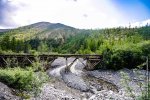 Я проехал по заброшенной трассе. Первая же преграда — полуразрушенный мост. Это место для отдыха. Люди приезжают сюда порыбачить, пожарить шашлыки, полюбоваться на реку. И дальше не едут. После моста — сплошные ямы, которые, на первый взгляд, машина не проедет. Чем дальше по трассе, тем меньше видно следов машин, буранов и больше следов животных. Дальше пути нет. В теплое время парни бы не проехали, так как много размытых участков, а мосты никто не ремонтирует – дорога снята с баланса.