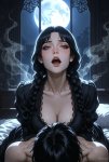 >>327405911 вот реквест Gothic girl inspired by Wednesday Addams, age 25-30, long black braids, pale skin, cold emotionless expression, sharp original face, completely nude, elegant reclining pose on antique velvet bed, cinematic moonlight from large gothic window, dramatic shadows, passionate intimate moment with faceless male silhouette (only lower torso visible), artistic censorship with tasteful black bars and soft glow, modern digital illustration, book-cover composition, saturated colors, glossy HDR finish, sharp contrasts, highly detailed, atmospheric, sensual but artistic, by Alphonse Mucha, Ilya Kuvshinov and Sakimichan
