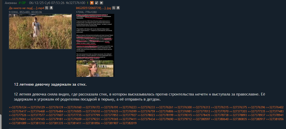 12 летняя девочка сняла видео, где рассказала стих, в котором высказывалась против строительства мечети и выступала за православие. Её задержали и угрожали её родителям посадкой в тюрьму, а её отправить в детдом.