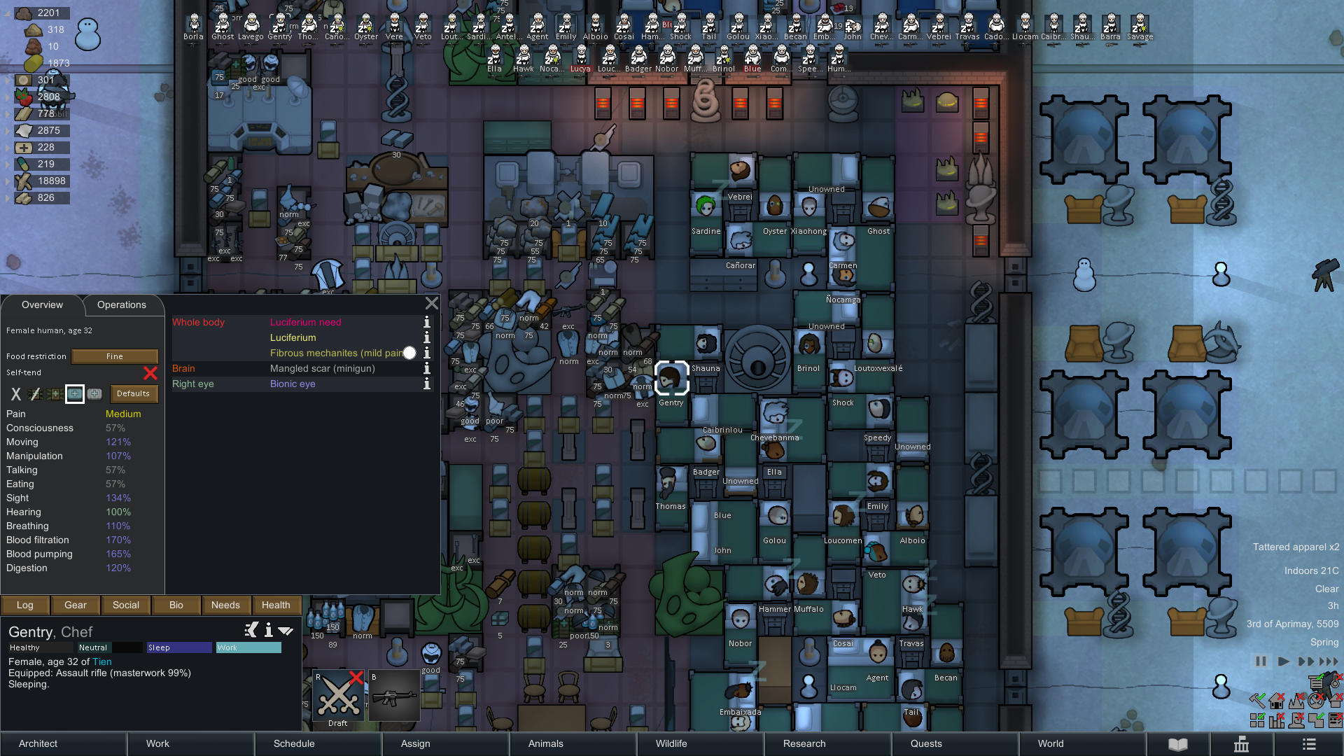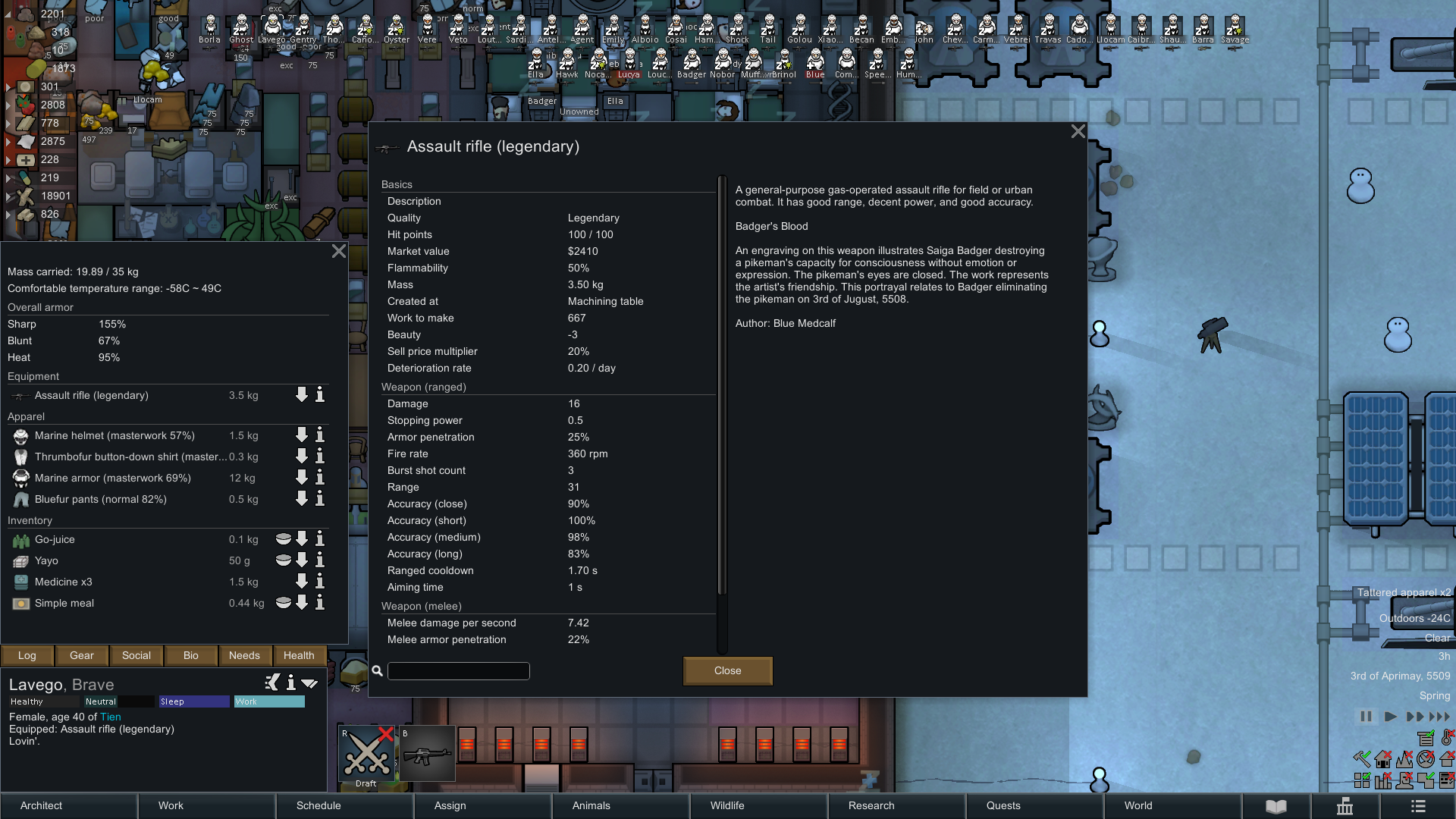 Легендарная винтовка и триггер-хаппи колониста, которую сделал Блю, один из трех оригинальных колонистов (наряду с Алексом-каннибалом и Рипли-успела-один-раз-сдохнуть-и-подсесть-на-люциферий-позже, которых я уже отправил в космос). У него была черта Industrious, две страсти к crafting и он просто целый день сидел за станком и делал винтовки/шлема/броню. Иногда ему проканывало вдохновение за счет высокого настроения и тогда вообще заебись было.