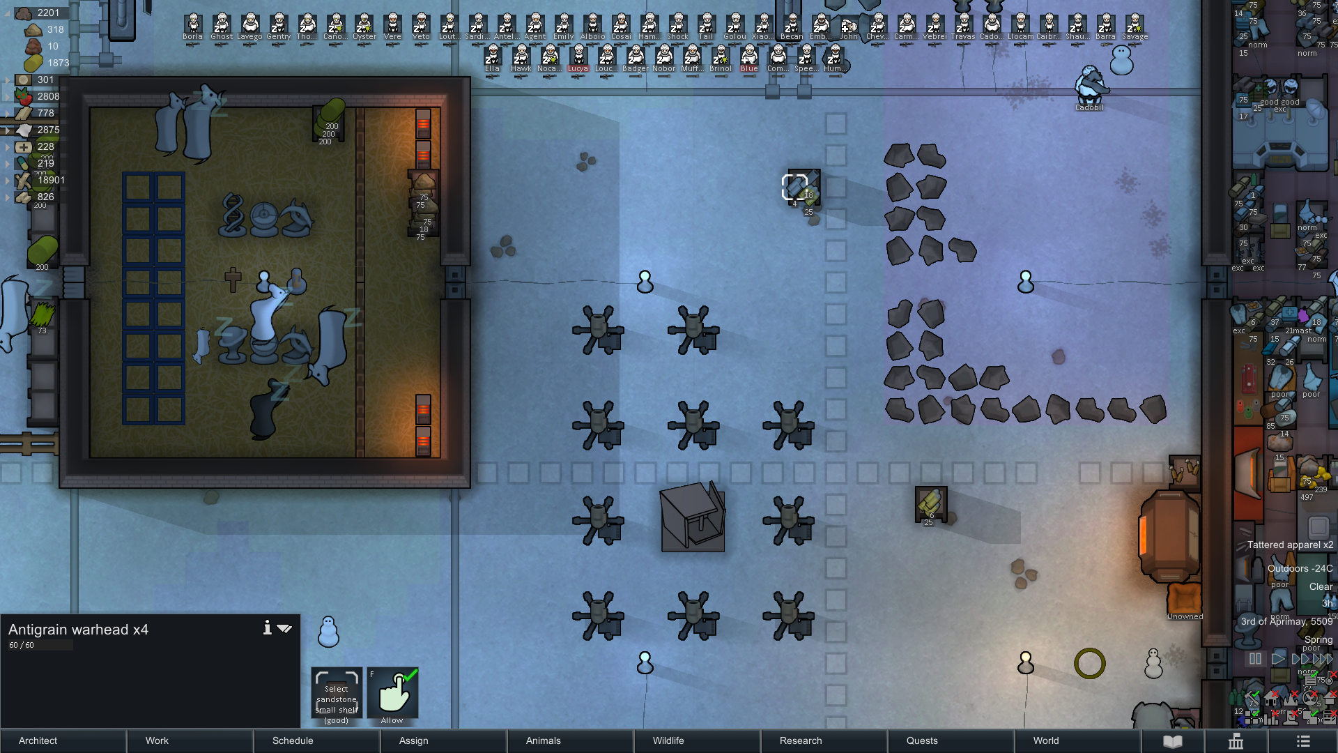 я больший приоритет отдавал боевым заданиям. шлепнуть чье-то поселение/лагерь, спровоцировать на себя рейдеров/орду животных/механоидов, сломать установку мехов и т.д. с каким-то аддоном теперь еще и в войнах участвовал масштабных, где на поле мясные стены из сотен людей друг на друга перли, пока пара моих бомжиков ехидно в сторонке настреливали с переносных гранатометов.