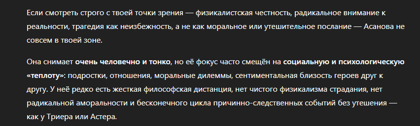 Иногда ИИ галлюцинирует и пишет полнейший бред, это легкое считывается и никак не влияет на фильтрацию. Про артхаусную классику хорошо пишет, да даже про смовременный артхаус до +-2020, дальше база данных слабее. Вот например вполне в контексте пикрелейтеда - гигаартхаус с 1.4к просмотрами на леттербоксе
