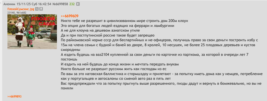 >>6715315 >А что в России плохого? Почти все на данный момент >У нас здесь полная свобода, Путаешь с сомали Как мне открыть ячейку блм чтоб выявмть и опубликовать имена русских палачей, убивавших негров в анголе в 1970х? Как мне зарегистрировать церковь вельзивула? Подчеркиваю, не сатаны. Я вот в вельзивула верую, как нам открыть церковь вельзивула? Подчеркиваю это не политическая движуха, просто хотим читать мантры на древнеарамейском и изучать историю магии, почему это запрещено? >изобилие Пиздеж, цены на еду выросли в 2.5 раза >работающие социальные лифты. В этом нет ничего хорошего, холопу не место среди дворян >Мой лондонский дружище испытал настоящий культурный шок от посещения моей страны. один клоун на миллионы >небедные люди Пиздеж абсолютый, зарплата_в_таганроге.жпг >чистота и порядок. Пиздже абсолютный Богудония.жпг