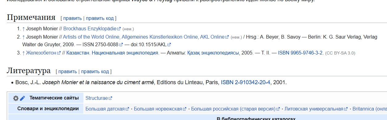 Примечания Joseph Monier // Brockhaus Enzyklopädie (нем.) Joseph Monier // Artists of the World Online, Allgemeines Künstlerlexikon Online, AKL Online (нем.) / Hrsg.: A. Beyer, B. Savoy — Berlin: K. G. Saur Verlag, Verlag Walter de Gruyter, 2009. — ISSN 2750-6088 — doi:10.1515/AKL Железобетон // Казахстан. Национальная энциклопедия. — Алматы: Қазақ энциклопедиясы, 2005. — Т. II. — ISBN 9965-9746-3-2. (CC BY-SA 3.0)