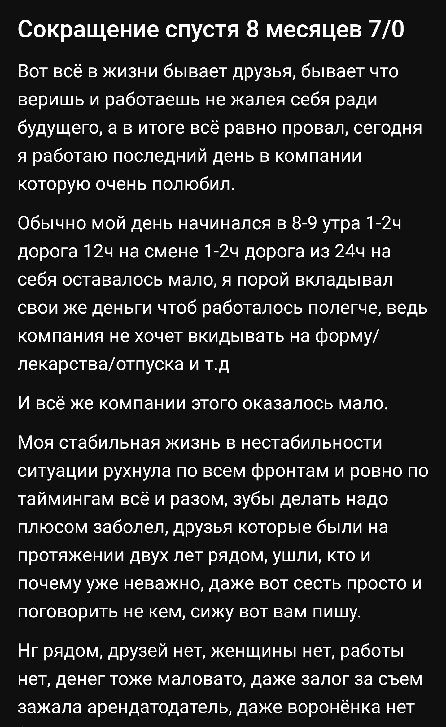 >>931099 Бля, чел, какие компромиссы ты нашел в работе вахтой, кому ты эти сказки втулить хочешь? человеку, у которого айкью больше твоего в 2 раза? Единственное во что я могу поверить, если ты охуенный рукастый спец сварщик/электрик и подтвердил через знакомых, которые не год работают у подрядчика, отсутствие кидков и нормальные условия, и попал на какую-нибудь нефтегазу за северный прайс. Во всех остальных случаях ты будешь рвать жопу за 2 копейки в рабских условиях с клопами в матрасе в вагончике с зеками и маргиналами. Вахтовик мечты. Скинь фото с объекта, пиздаболуш свободного пошиба. С каких это пор склад вб стал работой мечты?