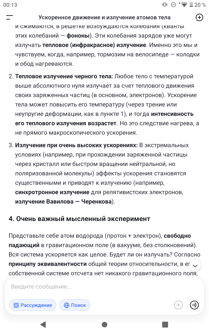 >>607817 >Первый как ты будешь обеспечивать ускорение? А если рассматривать амтомы в составе какого-нибудь тела, которое движется с ускорением? Ну допустим автомобиль. >Нет Вот и я интуитивно понимаю, что нет. Но чёт по идее нихоена не ясно. Да атом нейтральный, но составные же части не нейтральны. То есть по логики, тело движется ускоренно, следовательно, атомы из которого оно состоит движутся ускоренно, ядра, которые положительно заряжены, тоже движутся ускоренно, значит излучение как бы должно быть, но его нет. Почему? >На практике нейтральные молекулы и атомы никак не светят. Ну кусок металла который лежит, излучает в инфракрасном, чтобы светил в видимом диапазоне надо его нагреть побольше.