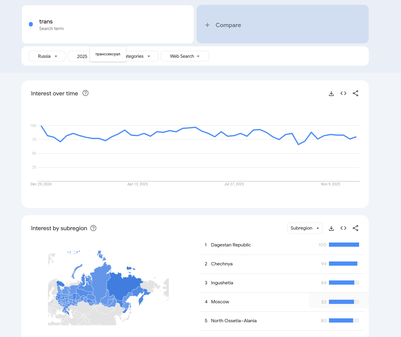 >>327504030 (OP) У нас по телевизору постоянно про трансгендеров и прочих трансформеров говорят и про их запреты. Вот людям и интересно стало, кто ето такие