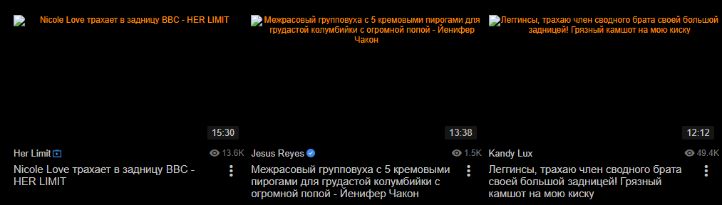 >честно, я даже в твоем скрине трансов не нахожу. Так ты скрин не жопой смотри. Первая выдача - поиск без фильтрации тегов дает 12488 видео. Берем эту же выдачу, запрещает 4 тега трансов, получаем 12150 результатов. Это на аккаунте, где "ориентация = гетеро".