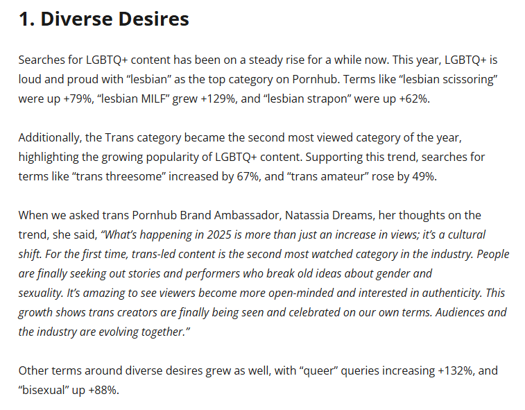 >>327504389 >>327504412 Собсно, если глянуть на статистику поиска из той же статьи, то окажется, что такую экзотику действительно мало ищут. Первая транс-категория начинается аж на 10 месте (femboy), а само это слово в поиске - на 18 месте (trans).