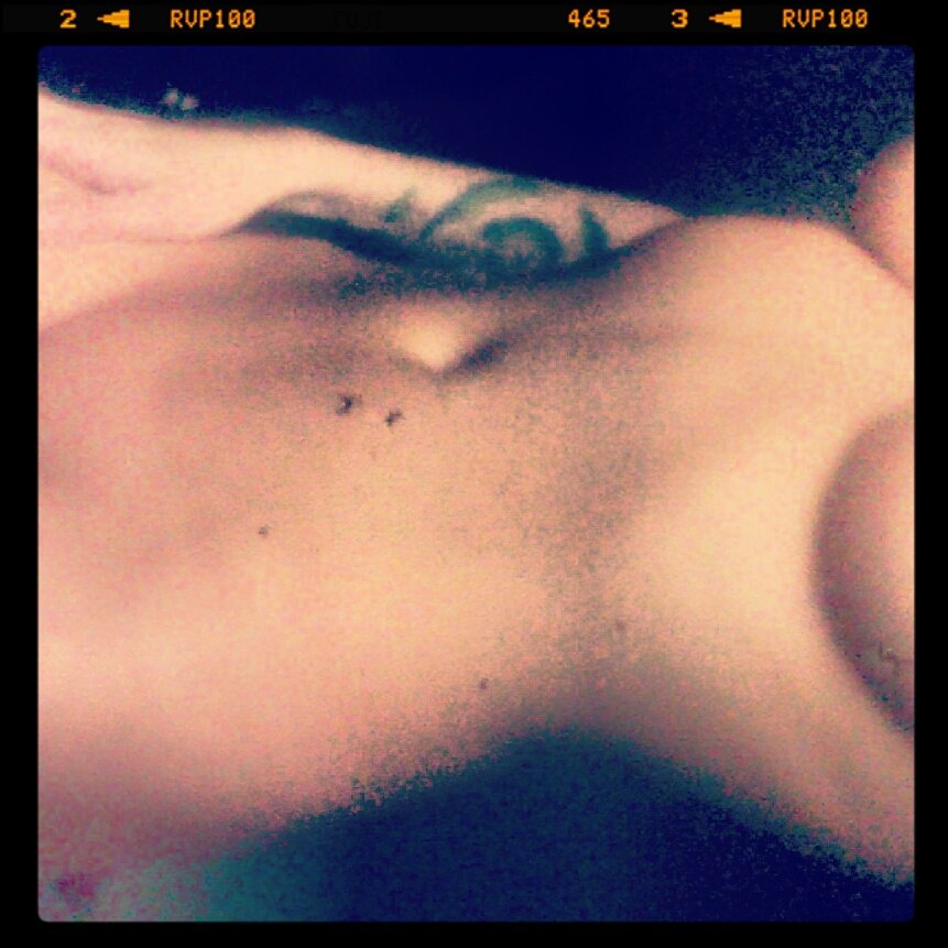 Выражение лица девушки спокойное и немного улыбающееся, несмотря на ситуацию. В целом, фотография выглядит как спонтанный снимок, возможно, сделанный сразу после интимного момента.