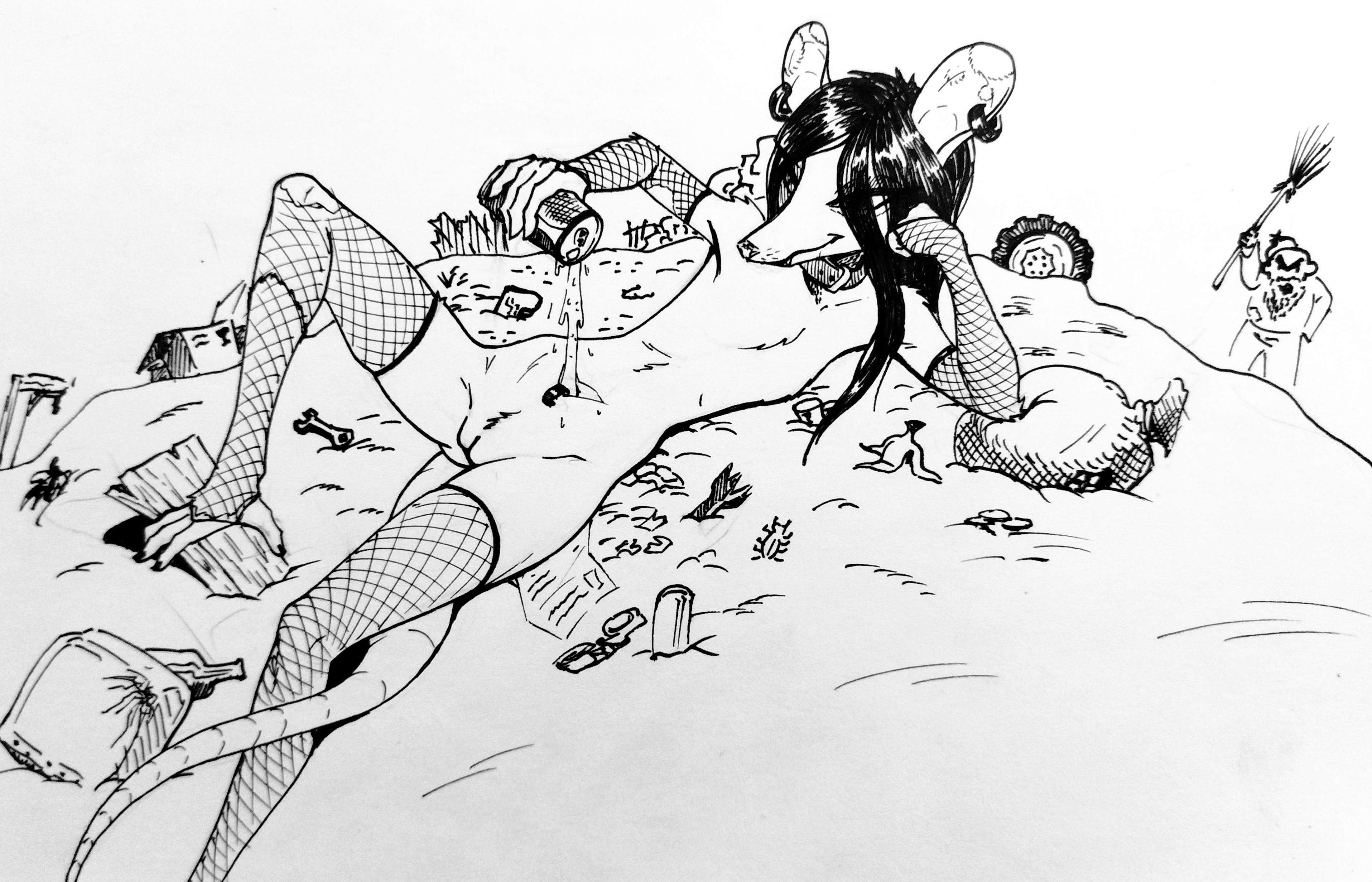 >>327558139 (OP) Реквестирую опоссумиху Максин с первой пикчи, которая сидит на груде хлама. Верхние веки отчетливо видны, словно устала иль пьяна, морда выражает типо улыбки. Максин выливает любой напиток из бутылки себе в сумку (отверстие с пирсингом на животе). А дворник просит её поскорей свалить, тем более та без одежды (эксбиционизм). Смысл: Максин пофигу, если её хотят изменить.