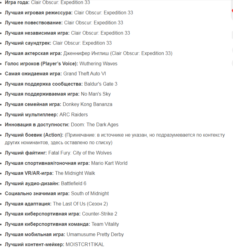 >>327572865 (OP) Игра года — Clair Obscur: Expedition 33 Лучшая режиссура — Clair Obscur: Expedition 33 Лучший мультиплеер — Arc Raiders Лучшее повествование — Clair Obscur: Expedition 33 Игра года, выбор игроков — Wandering Waves Лучшая RPG — Clair Obscur: Expedition 33 Лучшая AR/VR-игра — The Midnight Walk Лучшая поддержка от сообщества — Baldur's Gate 3 Лучшая спортивная или гоночная игра — Mario Kart World Лучшая музыка — Clair Obscur: Expedition 33 Лучшая дебютная инди-игра — Clair Obscur: Expedition 33 Лучшая стратегия/симулятор — Final Fantasy Tactics: The Ivalice Chronicles Лучшее художественное исполнение — Clair Obscur: Expedition 33 Лучшее приключение — Hollow Knight: Silksong Самая ожидаемая игра — GTA 6 Лучший файтинг — Fatal Fury: City of the Wolves; Лучший дизайн звука — Battlefield 6 Игра с лучшей поддержкой от разработчиков — No Man's Sky Лучшая социально значимая игра — South of Midnight Лучшая актёрская игра — Дженнифер Инглиш (Маэль из Clair Obscur: Expedition 33) Лучший экшен — Hades 2 Лучшая адаптация видеоигры — «Одни из нас» (второй сезон) Лучшая инди-игра — Clair Obscur: Expedition 33 Лучшая семейная игра — Donkey Kong Bananza Инновации в доступности — DOOM: The Dark Ages Лучшая игра для киберспорта — Counter-Strike 2 Лучший киберспортсмен — Chovy (League of Legends) Лучшая киберспортивная команда — Team Vitality (Counter-Strike 2) Лучшая мобильная игра — Umamusume: Pretty Derby ПИЗДЕЕЕЕЦ ПОЧЕМУ МИР ТАК ПОЛОН ГОВНОЕДОВ БЛЯТЬ!!!!