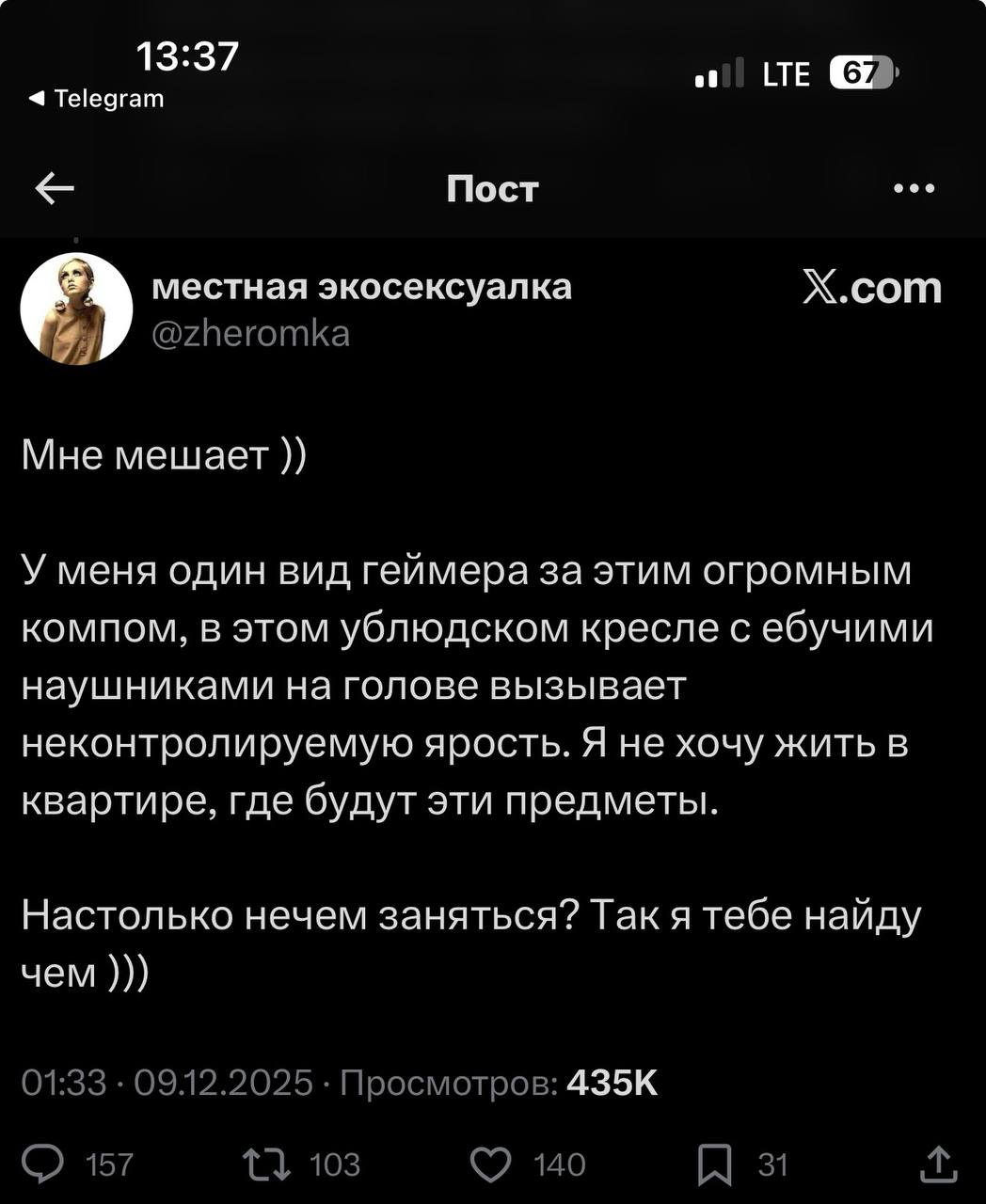 Тут сидят один или пара ебланов срущих про какое-то ведро с раками, дескать инцелы их отговаривают постоянно от вылезания, так-бы они уже гаремы имели, влюбляли бы зумерш, их баловали бы сочные mommy, на завтрак обед и ужин было бы по новой бейбе трех разных рас каждый день и одна любимая ламповая тян 100\10 которая была бы не против. Но я вот не понимаю, ну вылезешь ты и что тебе это даст. Даже если ты найдешь себе огра или даже норм бабу, сделает ли тебя это счастливым. Вот чисто я например хочу тяночку которую не ебали верблюды и узбеки, а по этому критерию уже к 18 годам многие натахи отпадают, и даже если будет у меня секс или отношения с красивой зумершей, но зная что ее ебли хуй знает кто на усраине, может ссали в лицо, может она очко лизала, сосала хуй как минимум точно, возможно мойщикам бассейнов, может даже сосала собаке, ну меня это счастливым не сделает. Окей, отбросим романтические маняфантазии, просто иметь насыщенную сексуальную жизнь. Но насыщенная сексуальная жизнь это даже не 5 огров с винчика в год. Это много баб, симпатию которых ты получаешь легко, максимально быстро и без заебов ебешь, и в том числе красивых, хотя для разнообразия и огров можно не слишком всратых (ради которых кто-то прям вылезал, для него это был подвиг, эмоциональные финансовые вложения, а ты чисто по приколу ее на вечер выцепил и на лицо сел и она тебе аннулингус сделала). Если бы ты был тем кто может себе позволить такой лайфстайл, действительно насыщенной сексуальной жизни без напрягов и вложений как для инцелов и нормигноя, то в треде бы этом не сидел. А просто вести прям очень активную социальную жизнь, иметь прочие приманивающие баб плюшки, кочать харизму чтобы быть на уровне обоссаного нормиса которому перепадает пускай даже раз в месяц и даже не от огра, ну это какая-то скучная хуйня. Про проституток вообще молчу, щлюхоходы это полный гной пидорский, хртьфу, насколько же ебанатом надо быть чтобы по сути дрочить об проститутку за деньги, ведь суть именно в том что ты вызываешь естественный интерес у женщин, это тещит эго и дает психологическое удовлетворение, а не просто то что ты не об кулачек подрочил а об вагину ыыы Чисто технически да можно конечно вылезти в нормисы, но суть да не в этом. Фундаментальный ресентимент гештальт, сужу по себе, это то что в подростковом возрасте не было любви, тем более взаимной с тяночкой только с отчимом, а тут уже хоть ламборгини себе купи, но велика то не было, сука. Заполнить эту дыру душевную могли бы две вещи, и то наверное не полностью, но впринципе можно было бы сказать что ты психологически вполне удовлетворен, пускай и не прям идеально. Первое это идеализированная романтическая влюбленность когда вы личностно близки, когда она девственница, вообщем родственные души как в аниме. Фантастический вариант, насколько 99% баб и инцелов разные, даже если брать аналогичные инцелам женские версии, абсолютно иной жизненный опыт. Второй вариант как в хентае, это про насыщенную сексуальную жизнь, пускай не родственную душу, пусть среднестатистические обычные бабы которых кто только не ебал, которые на личностном уровне тебе абсолютно не близки, которых ты не будешь любить, но чтобы их было много, в том числе с топовой внешкой, без каких либо претензий запросов (как у средней натрашки к степашке не чеду, при том что ее асламбек мог к