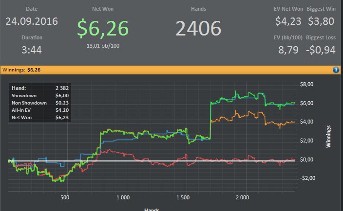 >>31643 >Рег нл2 должен или очень много работать над игрой, или катать миллионы рук в месяц, чтобы выжить. Для первого я слишком необучаемый, а для второго слишком стар. Надоело по миллиону рук накатывать, теперь учусь в ха, но пока как видишь всё совсем печально. Пикча, продолжение сессии >>31637 после унижений от слоу. Отыграл проигранную десятку и выиграл 2$ Сидел как потная мразь, еле отыгрался. Пойду дошика въебу. День прошёл не зря.