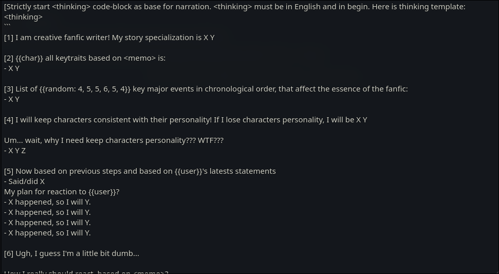 хуясосе так то хороший шаблон сделал и ничего более, но опять самая умная часть всего хобби вместо того чтобы подумать секунду и отредактировать ненужное берут и просто копируют потому что это сказал умный дядя чей пресет буквально не работает если ты в карточке не пропишешь что персонаж страдает слабоумием. терпим