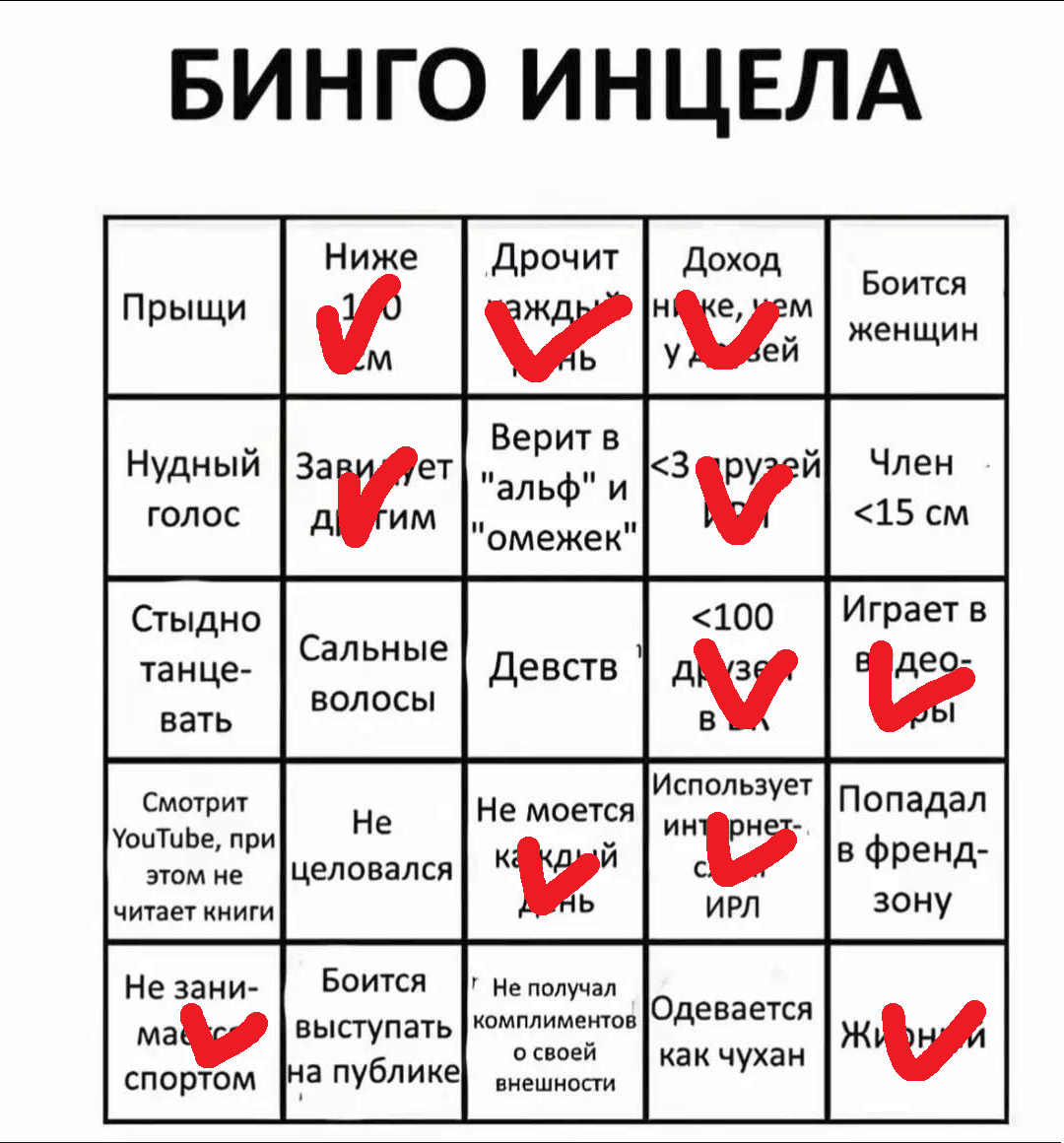 >>327671962 (OP) Хуйня таблица. >Боятся выступать на публике Вообще очень много людей боятся выступать даже не инцелы >Не моется каждый день Не нужно каждый день, если ты не работяга строитель и пр. грязные работы. >Друзей вк Зумеры вообще в вк сидят?