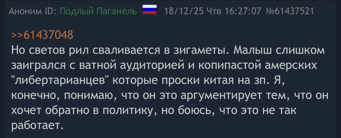 заигрался с ватной аудиторией и копипастой амерских "либертарианцев" которые проски китая на зп. Я, конечно, понимаю, что он это аргументирует тем, что он хочет обратно в политику, но боюсь, что это не так работает.
