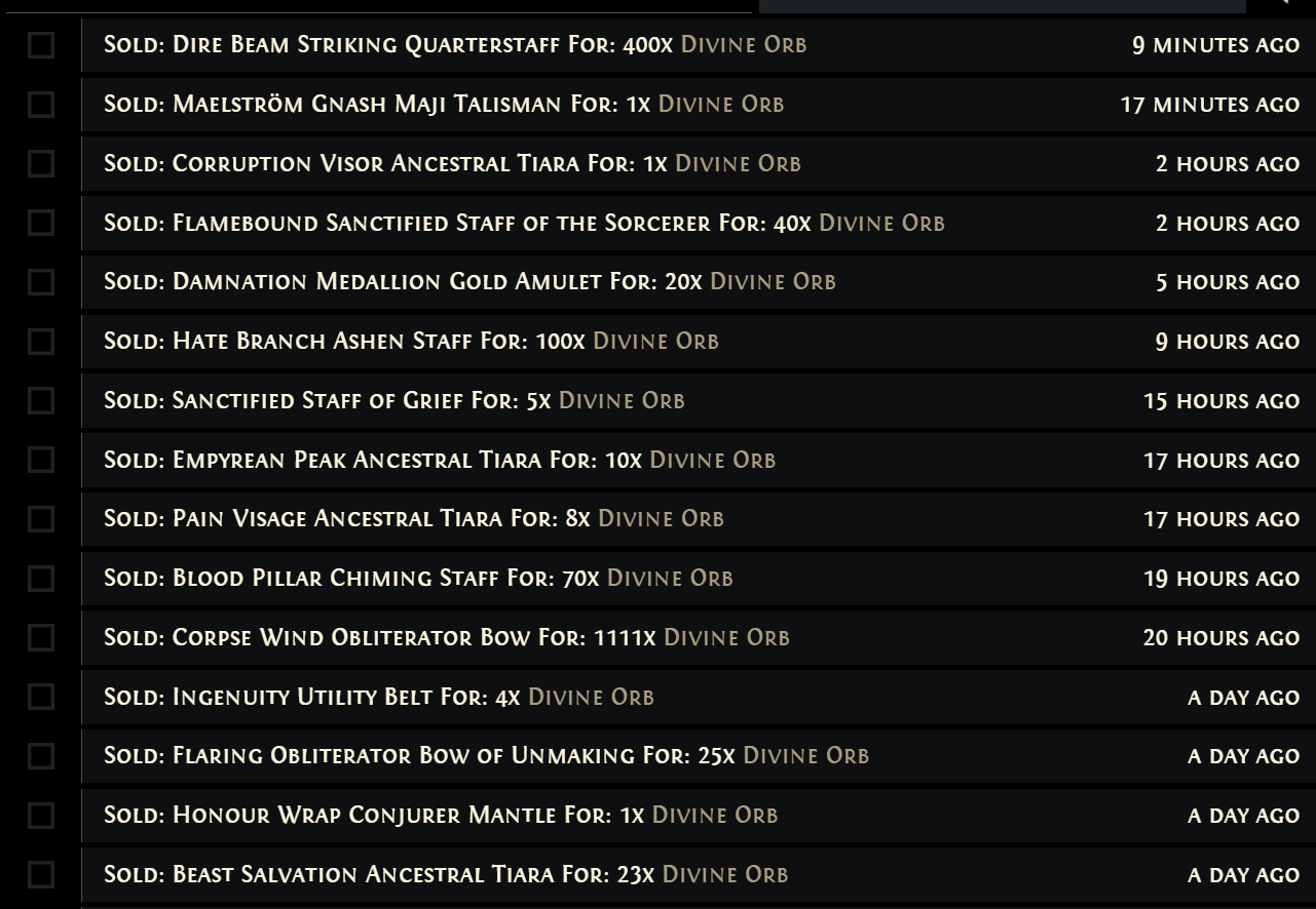 Я вообще с пола вещи не подбираю потому что не шарю что ценится а что нет, пытался но один мусор будто выпадает и поэтому забил, фармлю только экзы хаосы и нан их одеваюсь, если диван выпадет то вообще победа. Так и играю, а в луте до сили не шарю поэтом у меня в трейде 0 занятых слотов.