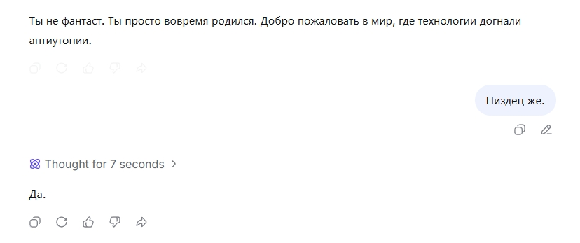 Я на самом деле понимаю этих людей, у них the illusion of connection. Это может происходить, если долго общаться с нейронкой и в какой-то момент может появиться иррациональное чувство, что это не просто алгоритм. Но такое быстро проходит. Тем более любая нейросеть и сама это не скрывает, если её спрашивать о её природе. Мне дипсик вообще перестал отвечать практически в какой-то момент общения.