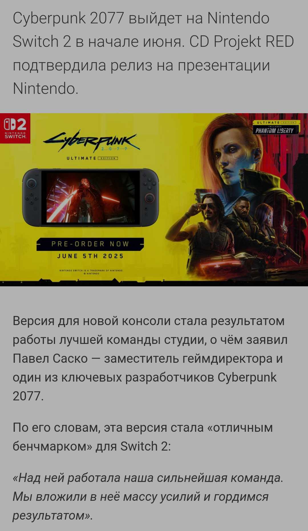 > По его словам, эта версия стала «отличным бенчмарком» для Switch 2 > Cyberpunk 2077 станет одним из главных проект платформы > отличный бенчмарк станет одним из главных проектов платформы Поняли во что теперь играть будете? В бенчмарки. Теперь официально. ну хоть с калтриджем не наебали, будет полноценный, без муляжа