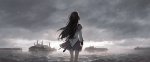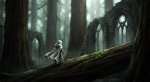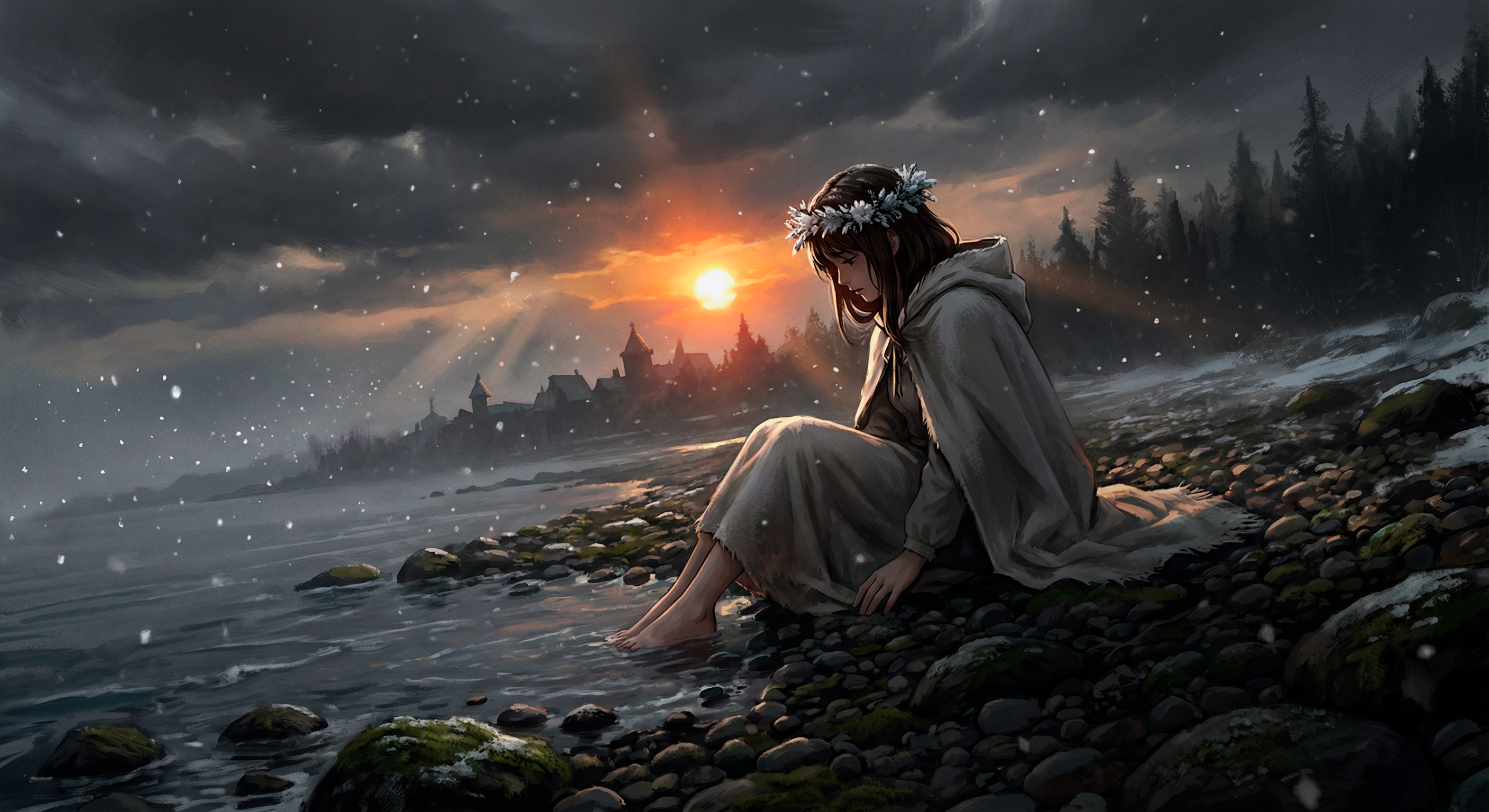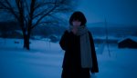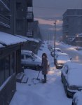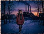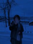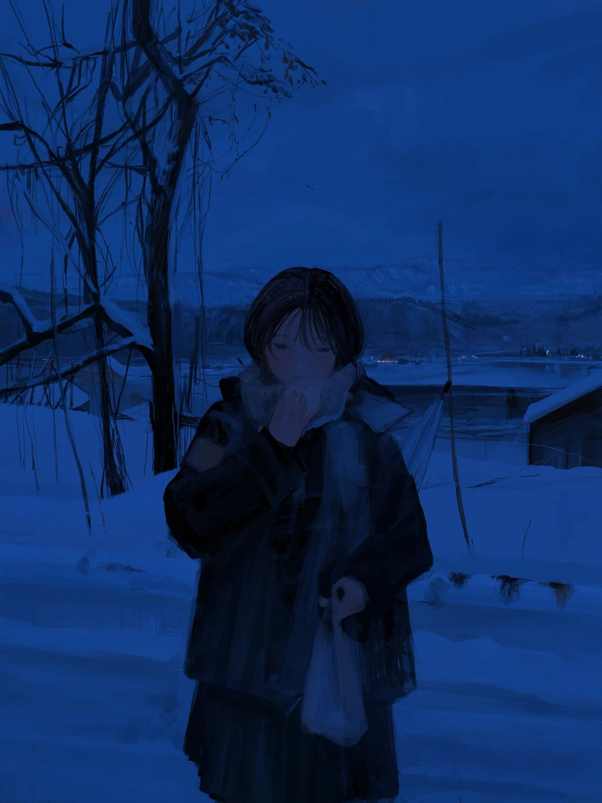 >>1463009 A vertical digital painting blending moody anime aesthetics with the distinct art style of Disco Elysium. A winter night scene rendered with heavy, expressive oil impasto brushstrokes and rough textures. In the foreground, a young girl with short black hair, wearing an oversized dark coat and a thick textured scarf, is spinning around in a wild dance. Her arms are outstretched wide; in one hand, she clutches a white plastic convenience store bag that swings violently in a wide centrifugal arc due to her rotation. Dynamic, abstract splashes of vibrant orange and deep indigo blue paint swirl around her, visualizing her movement against the cold darkness. The background remains a desolate snowy landscape with a massive, brutalist concrete railway bridge looming overhead and a dense, ominous wall of dark pine forest. In the distance, emerging from the forest thicket, a tiny silhouette of a shadowy black creature is running, barely visible. The atmosphere is cute yet eerie and unsettling, a mix of psychological intensity and cold winter solitude. banana pro