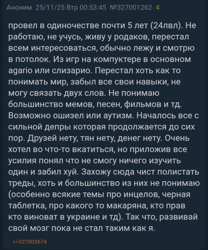 36 лет. Инцел. Бабы не было никакой. 173 рост. В школе/шараге бабы ненавидели. Не трогал даже за ручку бабу. В 28 осознал что уже все. Работаю доставщиком с зп около 40к. Боюсь 40 лет там все еще хуже. Я уже скуф полулысый. Страдаю от одиночества, друзей тоже нет. Машины нет, квартира съёмная, и то баба сдает, хотя сначала у парнишки снимал, потом пульт управления взяла баба, как узнала, что живет скуф. Приходит каждый месяц и все проверяет досконально, от баб несет презрением даже тут и недоверием. Думал пойти на сво, но потом передумал, потому что государству и ”родне“ похуй на меня даже там.
