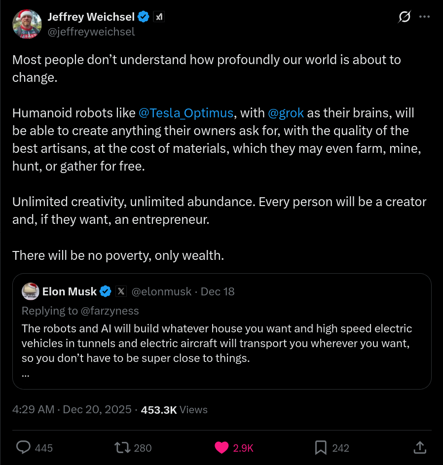 Джеффри Вайксель, инженер xAI: Большинство людей не осознают, насколько кардинально скоро изменится наш мир. Гуманоидные роботы, такие как Tesla Optimus, с ИИ Grok в качестве "мозга", смогут создавать всё, что пожелают их владельцы. Качество исполнения будет на уровне лучших мастеров, а стоимость - лишь по цене материалов, которые роботы смогут сами выращивать, добывать или собирать совершенно бесплатно. Безграничное творчество, безграничное изобилие. Каждый человек станет творцом, а если захочет - и предпринимателем. Бедности больше не будет, останется только процветание.