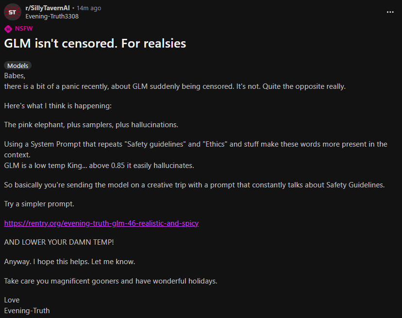 >>1468406 Хоупиум... >>1468407 Без терпилиума: идём на работу, снимаем облачные серваки за свои деньги, грузим туда аблит цидонию 70б и катаемся в прекуме и стреляем кумом в потолок что аж вытирать заебёмся. Можно ещё офф дипсик или глм 4.7 оплачивать, на праздники расчехляем Гемини 3.0 с ОР. Так лучше?