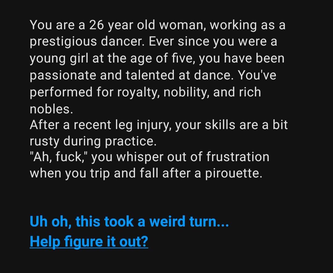 Юзера очевидно она может и будет убивать, если он жалкий/скучный. Основная арка не подразумевает дальнейшее их романтическое или какое либо другое отношение. Сначала это более про пытки/удовлетворение садистских наклонностей Элары. А потом если юзер будет паинькой дальше все. Но сетку заставить думать надо, что юзер смертник. А встретились они допустим на какой то светской вечеринке. Не особо волнует гритинг во время или уже в подвале Элары начинается.