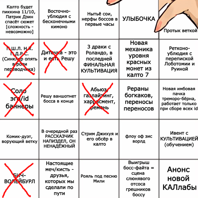Если я ничего не упустил, было много предсказаний на всё калто, на сюжет, новые механики, прогноз любой подливы. Даже бинго собрали. Но вроде ни одного по поводу грядущего МД. Стандарт теперь 6 этажей? Фьюзы мультистатуса из дефолтных статусных фьюзов? МДЕ до 20? Целая КУЧА новых гифтов EX качества, которые увидят 0.001% игроков? Хиден боссы теперь могут попасться на любом вопросике? Ваши ставки!