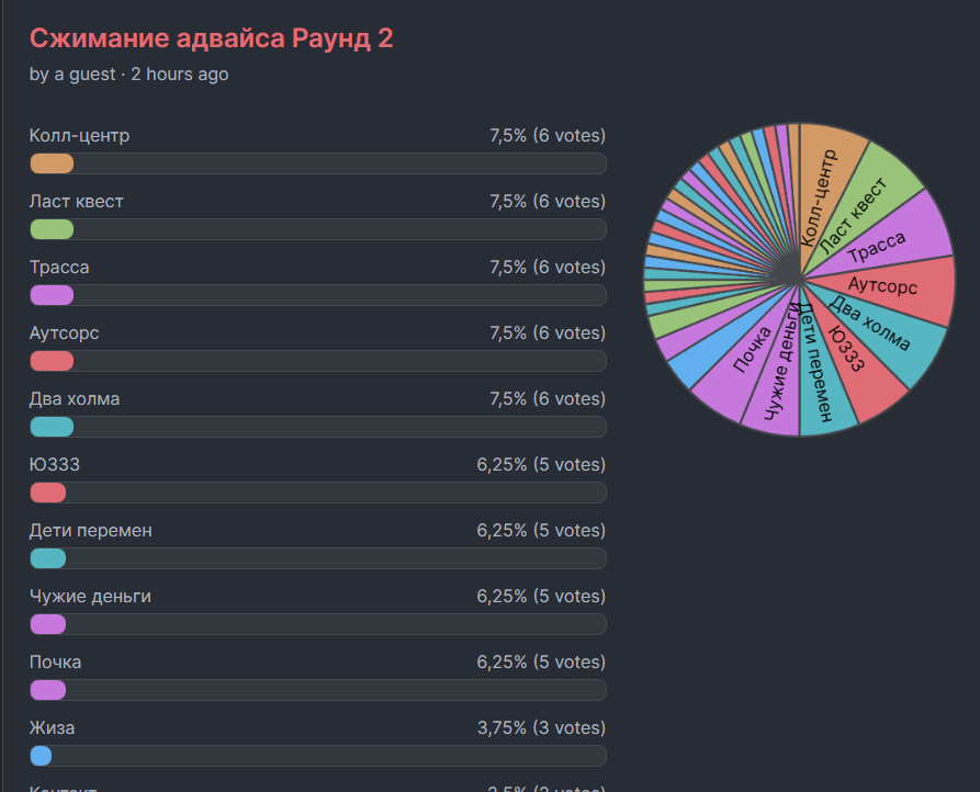 По 2% набрали: В списках не значился, Горыныч, Мастер и Маргарита, Первый на олимпе