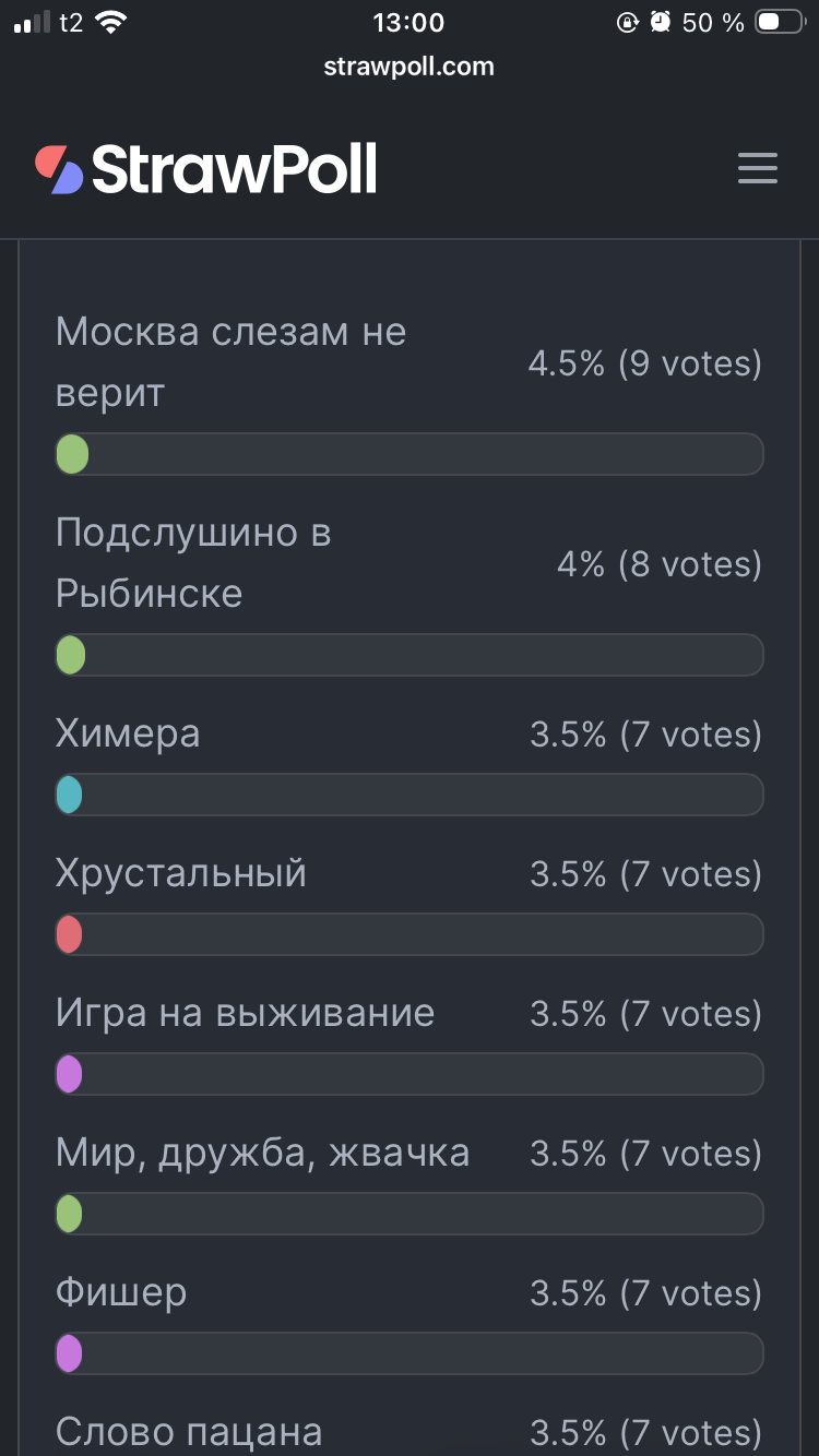 У тебя там сериал Ландыши, Физрук и Домашний Арест в кандидатах на вылет, хотя сделай опрос на самые достойные и они будут в топе тоже. А те сериалы, которые никто не смотрел дотянут до финала.