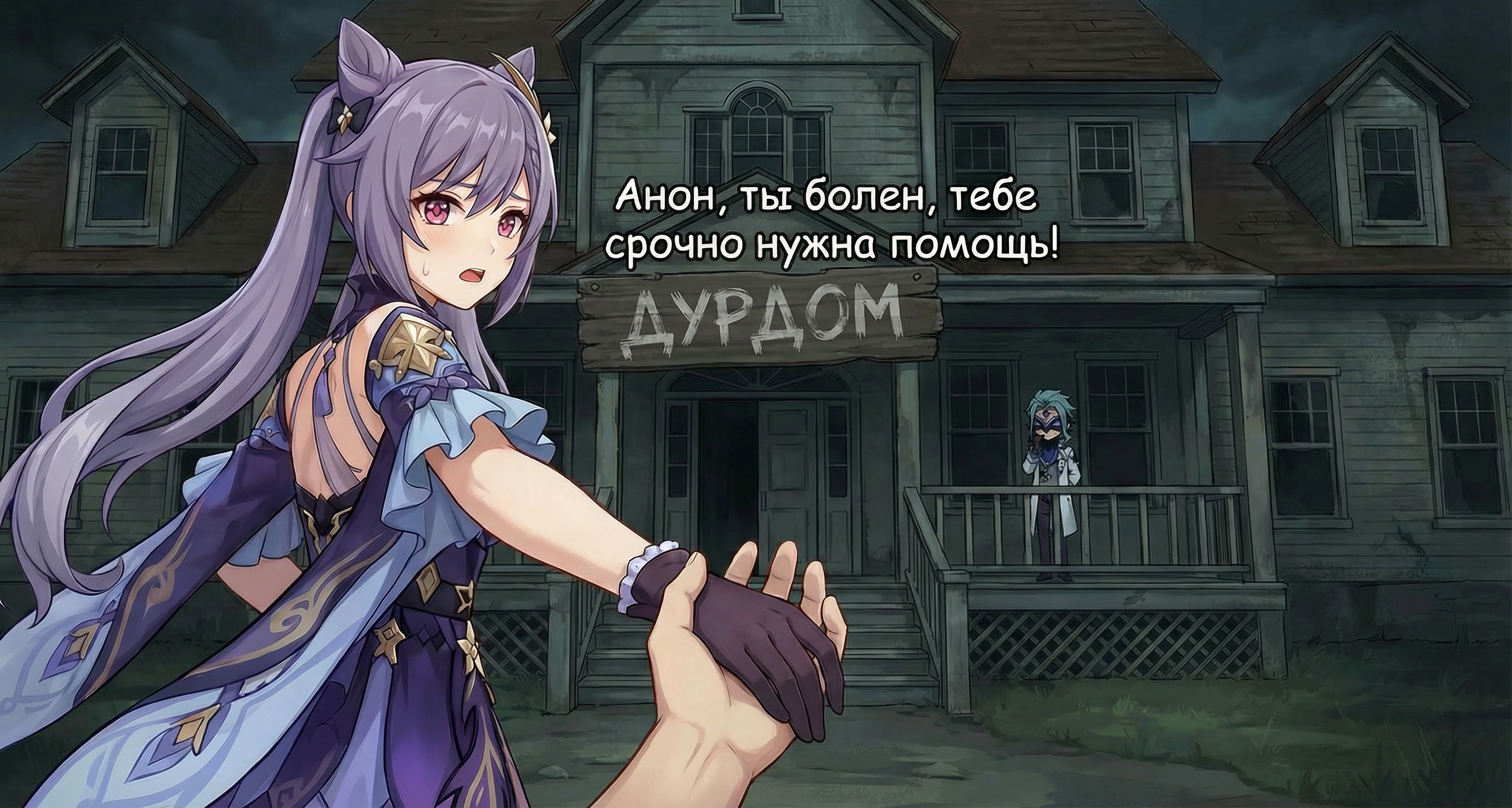 4. Вжушка ведёт за руку анона в дурку как на втором пикриле и говорит: "Анон, ты болен, тебе срочно нужна помощь!". На крыльце стоит Дотторе.