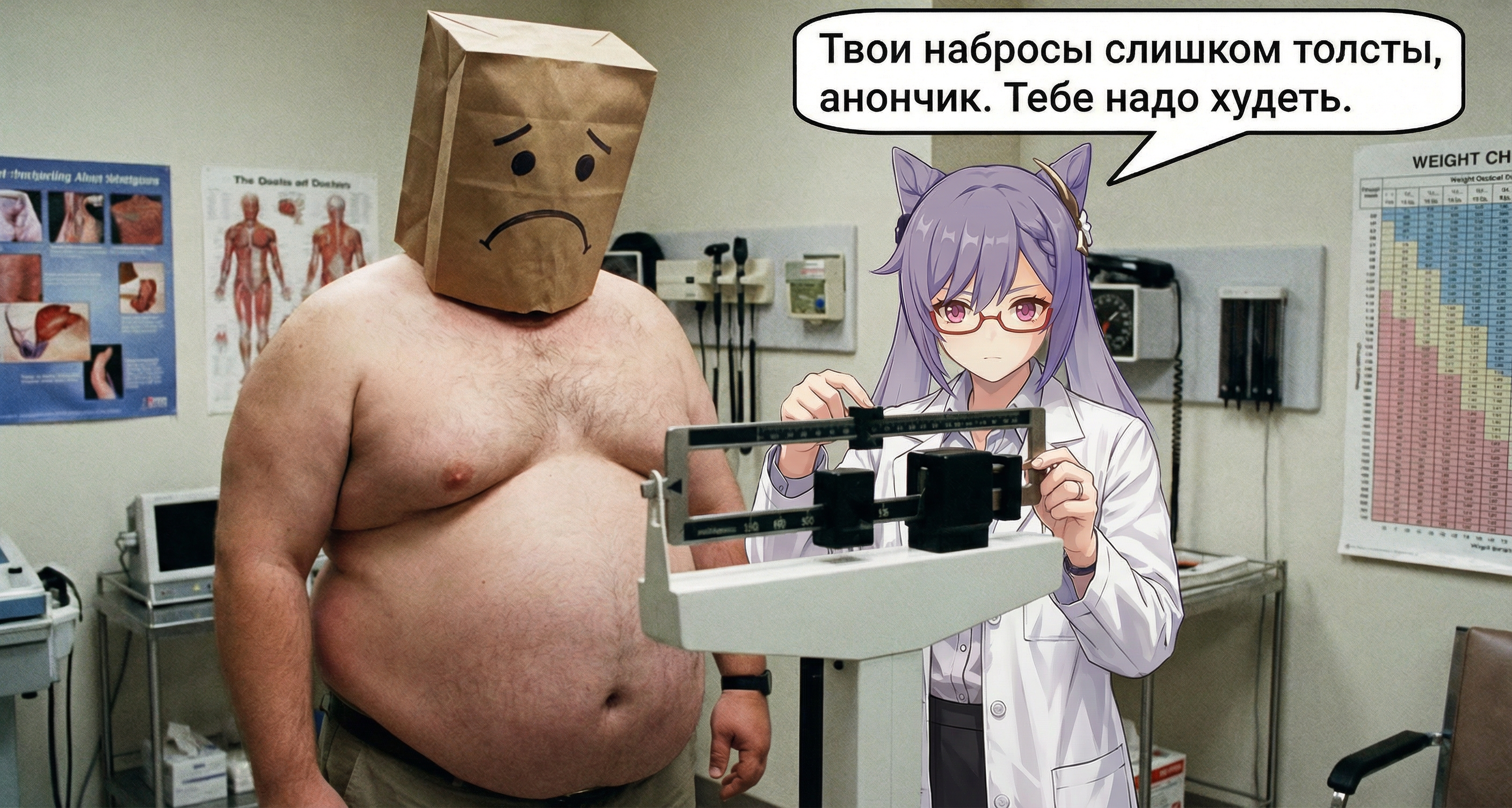 2. Очень толстый анон (грустное выражение на пакете) стоит на весах. Рядом Вжушка в очках смотрит на дисплей и говорит: "Твои набросы слишком толсты, анончик. Тебе надо худеть".
