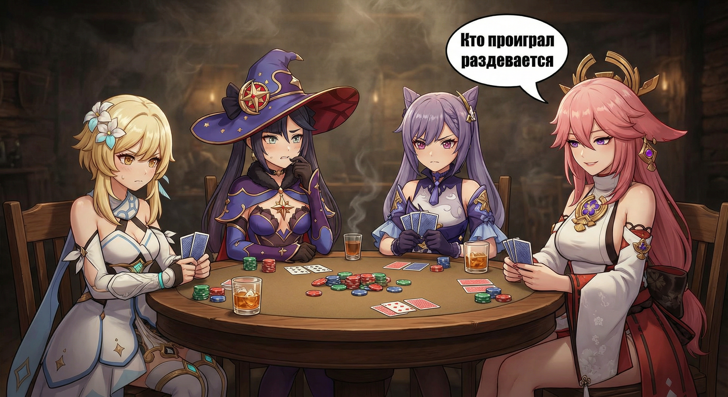 С репликами: Джинн: "Это был тяжёлый год". Нинка: "Бюждеты урезают, а сценаристы в творческом кризисе". Дыня: "Ваши старые вайфы больше не будут дамажить". Нахида: "В эндгейме будет больше кокблоков". Мявка: "Снежной не будет". Клумба: "С Новым годом! Начинайте откладывать на мой утренник!". В конце сгенерить Чмоню, сидящего за столом и смотрящего телевизор (на часах на стене 12). За столом Чича, Мидзуки, Дилюк, Мона и Тигнари. Чича говорит: "С Новым годом! С новым счастьем!". По щеке Чмони течёт слеза. Можно и без этого всего.