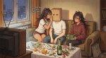 1. Большая картинка из двух половин. На первой красивая украшенная гирляндами стенка и наряженная пушистая ёлка, на её фоне со счастливыми лицами жгут бенгальские огни Светка, Вжушка, Коза Ганюша, Дэхья и Фурина. На второй - стенка с отклеивающимися обоями, ёлка-первый пикрил, на полу дерутся Серебряный Волк и Великая Герта, в углу сидит опухшая Светлячок и хлещет водку из горла.