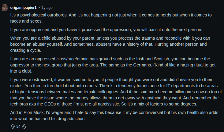 >>328049589 >>328049292 (OP) У нормиговна логическая ошибка. Как раз ботаны такие потому что их травили и игнорировали, поэтому когда ботан приходит к какой-либо власти или деньгам, он начинает навязывать всем свои хотелки.