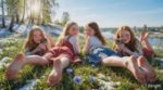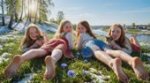 Соотношение сторон, гиперреализм, счастье, добрые эмоции, насыщенность цветов, вся фокусировка на людях, вид снизу от весенней травы, настоящая реалистичная фотография, свет светит на людей освещая их тела полностью спереди и создавая по сторонам небольшие частицы света, на переднем приближенном крупном плане в центре 8-year-old Elle Fanning и 8-year-old Emma Stone в темно-бежевой одежде для гимнастики лежат на животах спинами к камере горизонтально вытянув приближенные ноги на небольшом опускающимся холме покрытым ярко зелёной свежей травой и синими васильками слегка покрытыми снегом в полный рост и приподнимая и растягивая ноги в стороны и смотрят в камеру повернув головы и их ступни ног на переднем плане и приближенные 8-year-old Anya Taylor-Joy и 8-year-old Sadie Sink в русской национальной детской летней одежде держат в руках котят и лежат рядом по бокам слегка нагнувшись и при обнимая их, румянец на лицах, веснушки на руках и ногах, веснушки на лицах, длинные распущенные волосы без головных уборов, детальные глаза, на переднем крупном приближенном плане ступни ног без обуви, яркая весна, на заднем плане слева возвышенный холм покрытый весенним лёгким снегом и на нем слева берёзы покрытые инеем сквозь которые просвечивает солнце и ярко-сине-голубое небо и вдали справа река и русская деревня