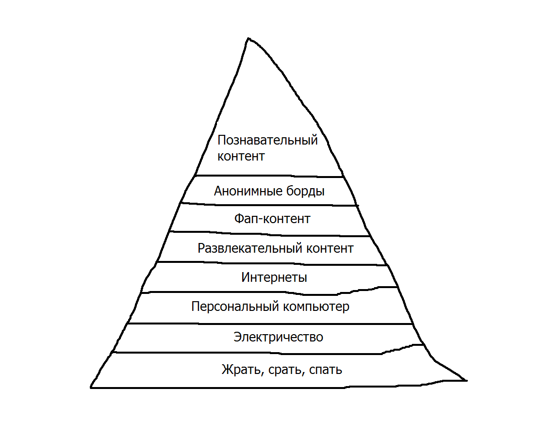 1. Жрать, срать, спать: Базовые физиологические потребности любого живого организма. Без этого выживание невозможно. 2. Электричество: Первый «технический» уровень. Без него не будет работать железо. 3. Персональный компьютер: Инструмент доступа в мир. База для цифрового существования. 4. Интернеты: Среда обитания. Без подключения компьютер остается просто коробкой. 5. Развлекательный контент: Мемы, видео, игры — то, чем заполняется свободное время. 6. Фап-контент: Специфическая, но неотъемлемая часть интернет-культуры, выделенная в отдельный важный слой. 7. Анонимные борды: Социальный уровень. Место общения, где «двачер» находит себе подобных, сохраняя анонимность. 8. Познавательный контент: Вершина пирамиды (аналог «самоактуализации»). Момент, когда пользователь начинает искать в сети что-то действительно полезное или сложное для саморазвития.