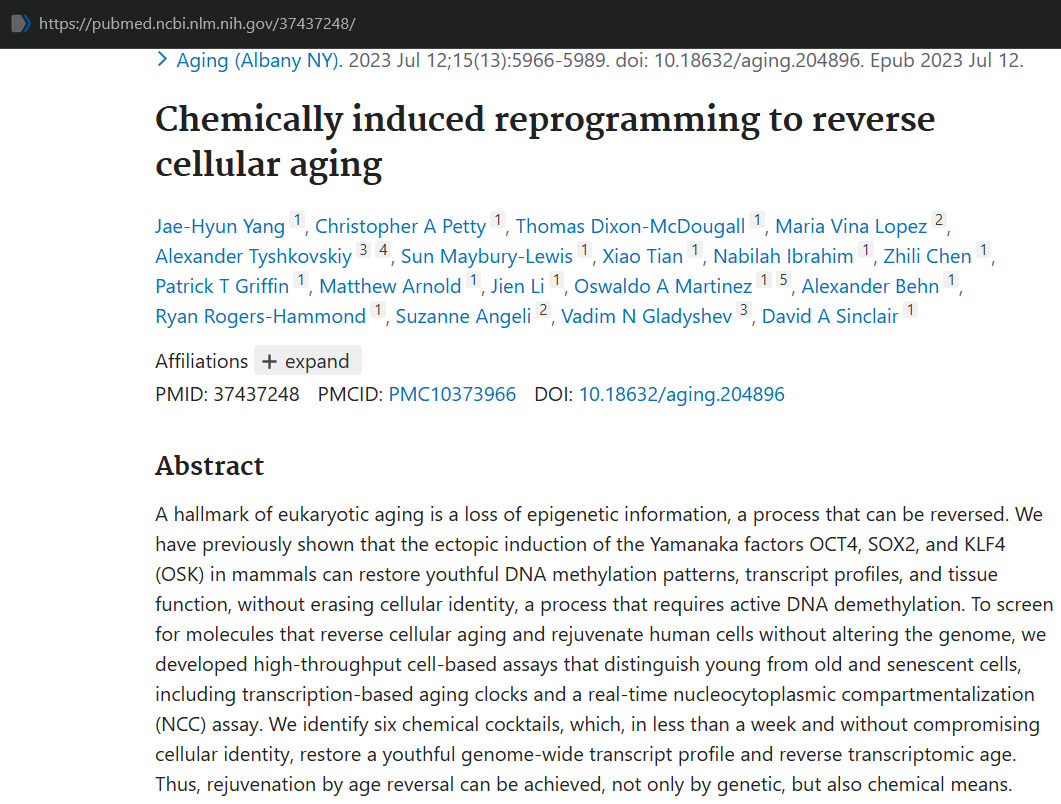 >>328090017 (OP) Химически индуцированное перепрограммирование для обращения клеточного старения https://pubmed.ncbi.nlm.nih.gov/37437248/ Отличительным признаком старения эукариот является потеря эпигенетической информации — процесс, который можно обратить вспять. Ранее мы показали, что эктопическая индукция факторов Яманаки OCT4, SOX2 и KLF4 (OSK) у млекопитающих способна восстанавливать «молодые» паттерны метилирования ДНК, транскрипционные профили и функции тканей без стирания клеточной идентичности. Этот процесс требует активного деметилирования ДНК.