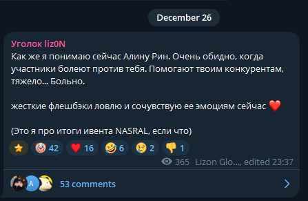 >Алина, ты сделала все, что смогла. Правила и участники оказались нечестными и грязными. Соответствующее название ивента, надеюсь не согласишься участвовать в следующем сезоне, если он будет конечно