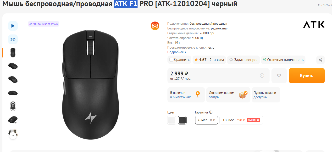 Забрал сегодня ATK F1 Ultra Max 2.0 за 3500. Начинка как у Rapoo, сток глайды чуток лучше, но все равно хуйня. Сменил на точки, на фото Обсидиан. Тяжелее VT0 на 7 грамм, ощутимо, но все еще норм. На 1К и режиме работе сенсора АТК Киберспорт, что чуть агрессивнее чем Fire у Rapoo, кажет 570-600 часов, что меньше чем, но все еще очень дохуя. Я за месяц VT0 разрядил на 55% всего. Новые мышки ахуй. А, сборка, все четко, 0 скрипов, сток глайды 2 слойные и под ними 2-я наклейка ебаная, снять тяжело. Места под точки иного, даже 8 мм влезут все.