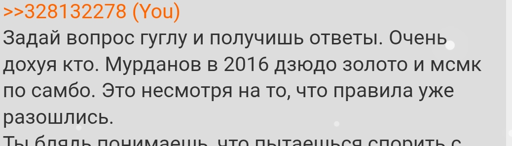 >>328132278 Задай вопрос гуглу и получишь ответы. Очень дохуя кто. Мурданов в 2016 дзюдо золото и мсмк по самбо. Это несмотря на то, что правила уже разошлись. Ты блядь понимаешь, что пытаешься спорить с тем, что небо голубое а трава зеленая? Это как тайский бокс и к1