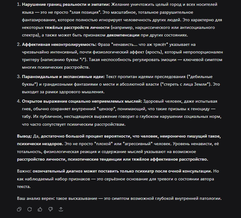 >>61503084 >>61503120 >>61503194 Не, ты действительно болен. У тебя вызывает ненависть всё, что связано с украинцами и Украиной. Это ненормально. Возможно у тебя какая-то травма, от которой ты никак не можешь оправиться. Но задатки у тебя очень нехорошие. То, что ты серишь тут - уже трактуется как нацизм и шовинизм. Это не я придумал. Понятное дело, что психически больные никогда не признают того, что они психически больные, но если в твоём распадающемся на куски сознании сохранилась доля разума и адекватности послушай меня. Пообщайся с ии в конце концов, если нет денег на психиатра, или боишься идти в пнд. Про то, что ты несёшь бред я в очередной раз говорить не хочу. Это и ежу понятно. Просто твоя ненависть и желчь - сжирает тебя самого.