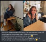 Ну да, обычная ебанутая в голову жируха не знает, чего хочет. Не говоря уж о подаче, где я королева, плетитесь за мной. Ноль инфы о себе, о интересах, о чем-либо.