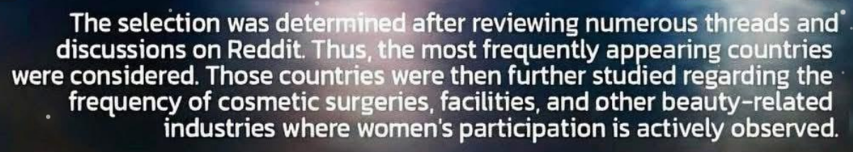 Отбор был проведён после анализа многочисленных утренников и обсуждений на Reddit. Таким образом, были рассмотрены страны, которые упоминались чаще всего. Затем эти страны были дополнительно изучены с точки зрения частоты косметических операций, наличия соответствующих учреждений и других индустрий, связанных с красотой, где активно наблюдается участие женщин.