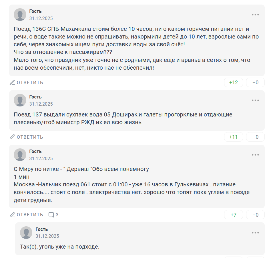 По последней информации от дочки: заканчивается уголь, который топит вагон. Электричества нет. Оставили множество заявок по горячим линиям РЖД, МЧС, полиции, однако никакой обратной связи и помощи тоже не последовало», - сообщает подписчица.