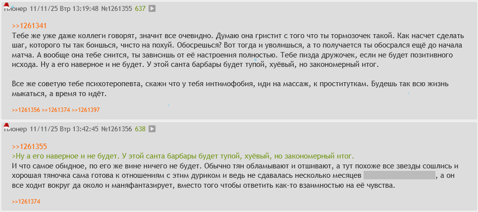 Была одна тян, сразу же заприметил её, когда поступил в универ на 1 курс. Прям с первого взгляда почувствовал, что у нее на душе такой же пиздец, как у меня. Ссался очень с ней познакомиться ближе, так как я в принципе очень тревожный человек. Мне вообще казалось, что она норми с друзьями и хуюнчиком. (Спойлер: она листва и всех кто к ней подкатывал до этого, отшивала). Она тоже в какой-то депре была, это чувствовалось прямо. В итоге на этой почве она и потихоньку слилась с универа. Пытался к ней потихоньку подкатить, написал ей через Добропочту. Этим скорее напугал. Потом в какой-то момент, когда я был на лютой дизморали и думал, когда были всякие эти угрозы ядегхкой, подумал, а хули терять. Через ебейшую тряску написал ей. И она ответила. Пропиздели с ней до 3 ночи. И с этого дня у нас переписка можно сказать нон-стопом шла. Т.е. не было такого, чтобы кто-то кого-то игнорил без ответа, могла быть просто задержка ответа. Очень много общего было. Потихоньку начал звать гулять, начали гулять. Споллер - за ручку не держались и не целовались. Всё наше взаимодействие длилось с осени до конца весны где-то. Ну общались общались, я чувствовал, пытался во флирт а она никак. Чувствовалось, что она не заинтересована во мне. Ну спросил в лоб кринжово очень, в переписке, мол хто мы. Она сказала что думала, что друзья. Потом сказала что не знает, что чувствует и попросила узнать что чувствуют мои знакомые, которые в отношениях, чтобы понять (лол). Ну в итоге грит давай посближаемся. Ну вот так мы тусили тусили, вроде бы всё лампово было, но романтик устроить каждый из нас ссался, я боялся приставать и т.д. Один раз когда гуляли защитил её от быдла какого-то, она сказала что такое сближает. Помню даже проходили совместный тест на совместимость типа как кун и тян. Ходили вместе на концерт симфонический по одной игре. Помню ещё флиртовал так типа "го поняшимся на берегу под пледиком" а она была и не против типа в теории. Она звала к себе даже, но т.к. мы оба жили с ебанутыми мамашами, то момент было поймать сложно, чтобы никто не доебывал, так что не срослось. Потом мы устроились на работы, буквально в 10 минутах ходьбы друг от друга. Я после работы заходил к ней каждый раз, кринжово чето пытался, обнимались (это единственное интимное что у нас было лоул), приносил вкусное. Вы спросите всё ведь так хорошо, штоже случилось. Ну, я к тому моменту был классическим двачером - женоненавистником, озлобышем, инцелошизом и так далее. Сначала, когда я её познакомил с двачем, она положительно отреагировала, когда я например рассказал ей про набеги на фист. И типа это прям влюбляло. Она ещё такие истории рассказывала, как двачерша, а меня такое в тян подкупает пиздец, когда тян тоже немного панкуха, а не пердящая цветочками пикме. А под конец сказала мол заебали твои пасты про говно, и вообще "свою хуйню друзьям своим (имелось ввиду двачеконфу) присылать). Я ей постоянно ныл какую-то хуйню, как педовка какая-то. А она терпела. Помню сказал ей "когда ж ты меня нахуй пошлешь". А она сказала "никогда, понял?" Ну и мы часто срались на гендерной почве, про феминизмы, инцелизм и прочую хуйню. (Споллер: я после этого на почве вины очень сильно поменял свое мировоззрение с инцельского на чуть ли не профемное, щас вот до сих пор потихоньку прихожу в баланс). Ну и просто под конец мы стали реже гулять, когда я к ней приходил н