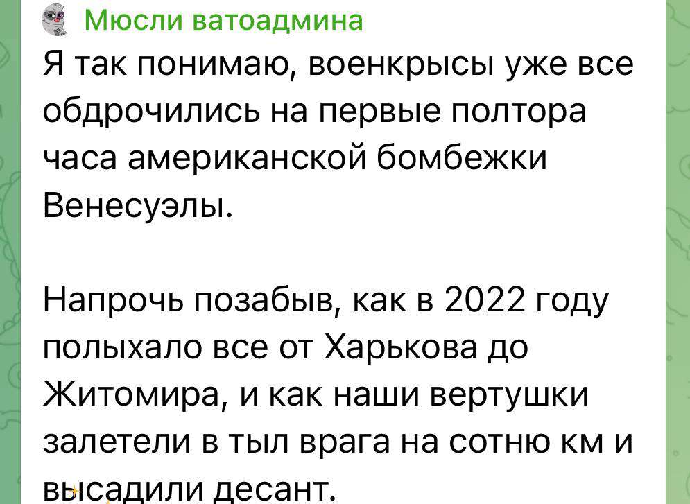 Весь треп Трампа о том, какая это была крутая военная операция, просто болтовня. Ага, охотно верю, что американцы вошли через главный вход и, не встретив сопротивления, прошли парадным строем по Каракасу, после чего также вышли. Как на воскресной прогулке. Если рассматривать это как операцию ЦРУ, то операция действительно крутая. А про военную операцию - кому-нибудь другому хер в ухо вкручивайте. Это не операция военной силы, а операция силы денег. Коррупция - она везде коррупция.