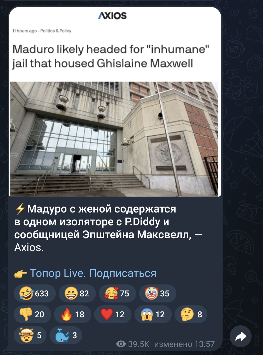 А что с Мадуро? Его точно уже не убьют. Если убивать его, то это нужно было делать при задержании. Обвинения в государственной торговле наркотиками нелепы. А вот желание прибрать нефть у Венесуэлы ясно как божий день, да Трамп этого уже и не скрывает. Суд может превратится в фарс. А если Мадуро будет вести себя в заключении и в суде, как президент суверенной страны, он может стать героем для всей Южной Америки, и её может консолидировать против гринго.